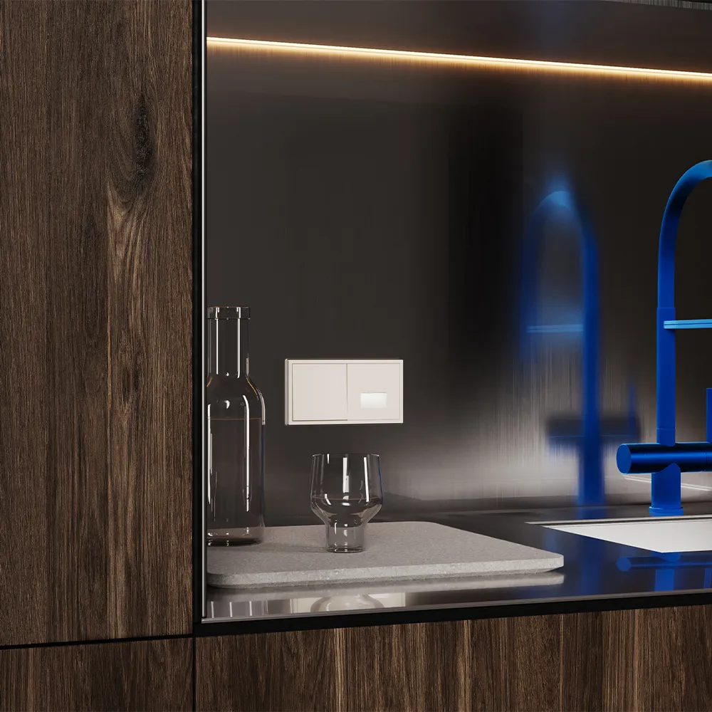 Выключатель полностью совместим с пластиковыми и стеклянными рамками той же серии и гармонично вписывается в любую композицию из розеток, выключателей и других устройств VOLTUM S70.